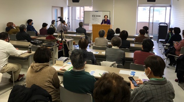 郡さんの後は乾晴美さんの講演でした。こちらも当時10歳であった少女の目から戦前の子どもの暮らし、学校の様子などが語られました。参加者の中には小学生もおりましたが、乾さんのお話に身を乗り出して聞いていました。このイベントができたのは何よりも退女教の皆さんがまとめた「私が軍国少女を生きた時代(とき)」という冊子があればこそです。今後も平和の尊さを共有し,互いに学べる場をつくりあげていきたいと思いました。