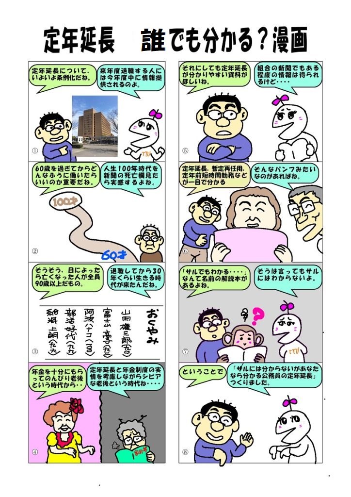徳島県でも9月県議会で定年延長に関する条例案が提案され,可決する見込みです。徳島県職員、定年65歳に延長 県が条例改正案を提出へ|政治・行政|徳島ニュース|徳島新聞電子版 来年度で定年を迎える職員には今年度中に情報提供が行われます。分かりやすい資料があるといいなぁということで漫画にしてみました。