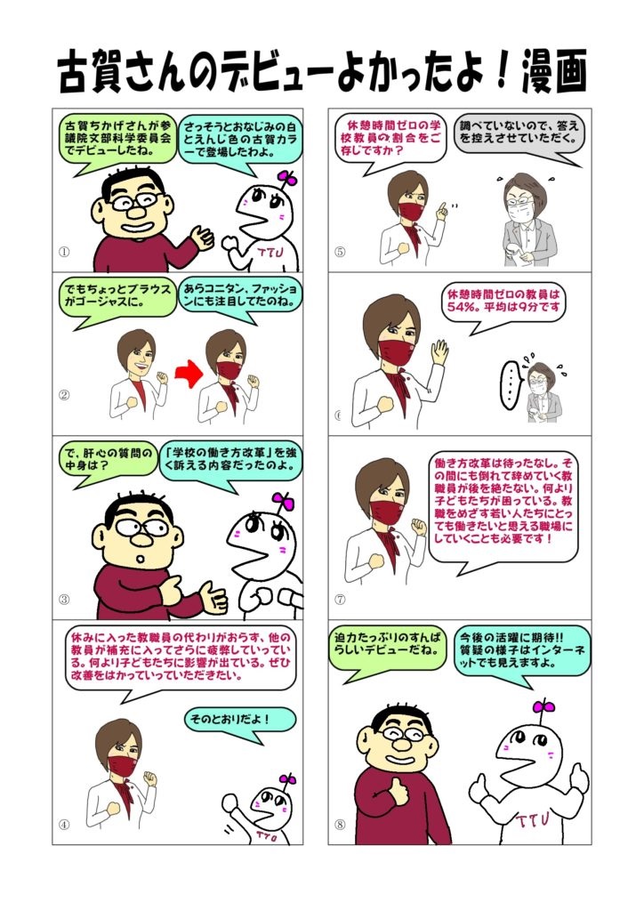 10月27日の参議院文教科学委員会で古賀ちかげさんが質疑に立ちました。まさに現場の声を国会に届ける素晴らしい内容でした。うれしかったので漫画にしました。なお,質疑の内容はインターネットで見ることができます。