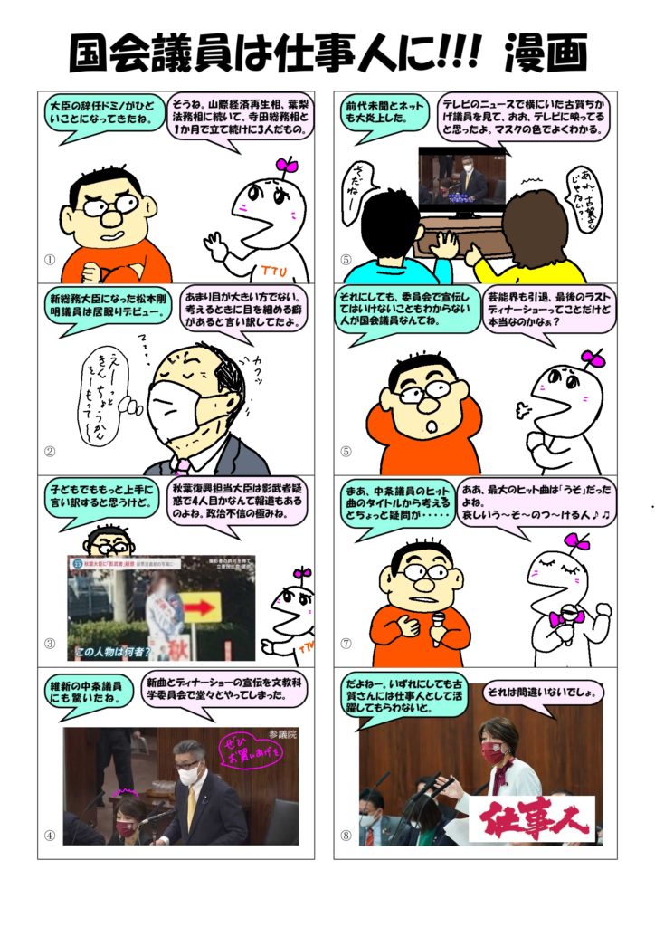 2022年11月30日 / 最終更新日時 : 2022年11月30日 管理人 未分類 国会議員は仕事人に!!! 漫画 大臣の辞任ドミノに文部科学委員会で新曲やディナーショーを宣伝する国会議員。しっかり仕事をしてもらわないと国民は嘆いていますよ。という気持ちを漫画にしました。 Bluesky