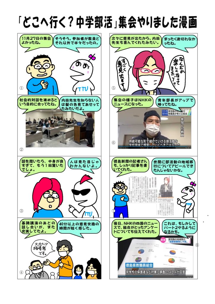 11月27日(日)に開催した集会について報告しましたが,あらためて漫画にしました。集会の様子はNHKで放送されました。また地元の徳島新聞も記事にしてくれました。集会以降に組合でとったアンケートに関する取材もあり,四国内のNHKのニュースでも報道されました。参加者からは,保護者はこのようなことについて、ほとんど知らないから,地域ごとにこうした集会をやってほしいという感想がありました。