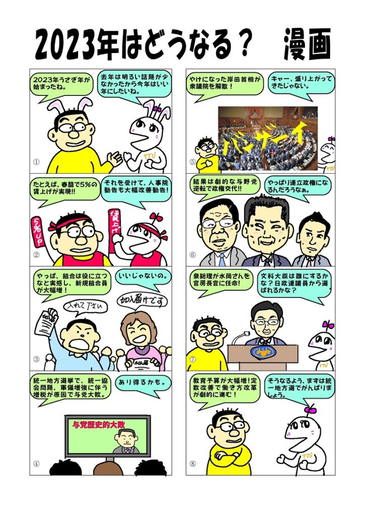 2023年1月4日 / 最終更新日時 : 2023年1月4日 管理人 未分類 2023年を占う 漫画 新しい年,2023年になりました。皆さま,明けましておめでとうございます。昨年は,暗いニュースが多かったですが,今年こそ笑顔あふれる年にしたいですね。2023年を占う漫画を描いてみました。さて,どうなるかな? Bluesky