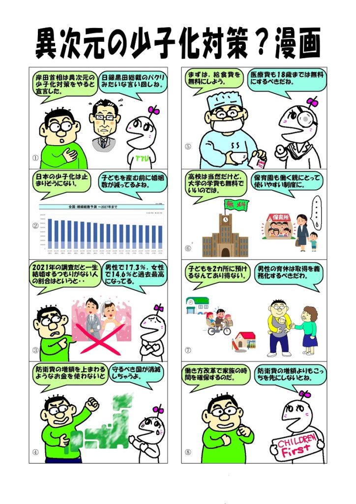 2023年1月20日 / 最終更新日時 : 2023年1月20日 管理人 未分類 異次元の少子化対策?漫画 岸田首相は異次元の少子化対策をすると言っています。少子化対策を本気で進めることには大賛成ですが,支持率アップねらい・統一地方選前の点数稼ぎでは?と疑ってしまうのは間違いなのでしょうか・・・・。 Bluesky