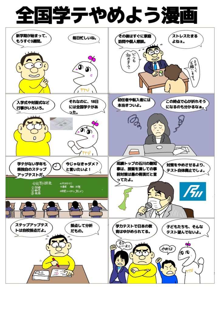2023年4月21日 / 最終更新日時 : 2023年4月21日 管理人 未分類 全国学テやめよう漫画 今年も実施された,全国学力学習状況調査。4月18日という早い時期の実施です。忙しい学校にさらに仕事を増やし,競争をあおる結果を招いているこの調査。もう見直す,いや廃止する時期ではないでしょうか。 Bluesky
