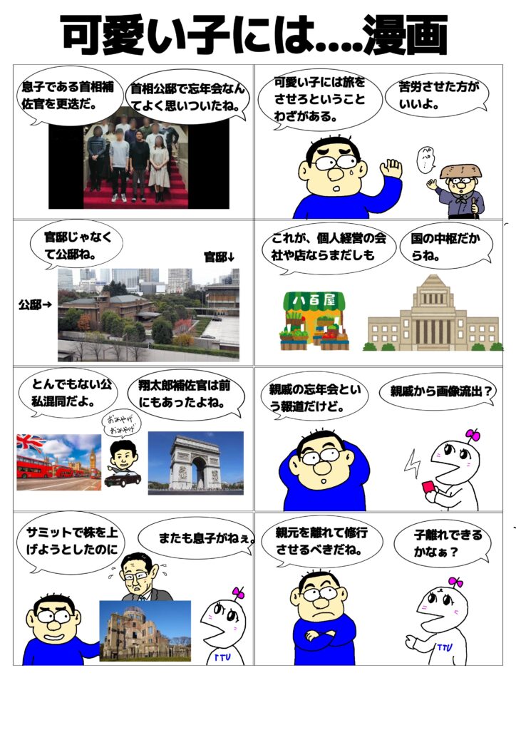 2023年5月31日 / 最終更新日時 : 2023年5月31日 管理人 未分類 可愛い子には…漫画 首相秘書官を務めていた実の息子を、やむなく更迭。親の心子知らずということでしょうか。いずれにしても、国費を使っての世襲議員の育成は、やめていただきたいものです。ちなみに今回は大失敗ですね。 Bluesky