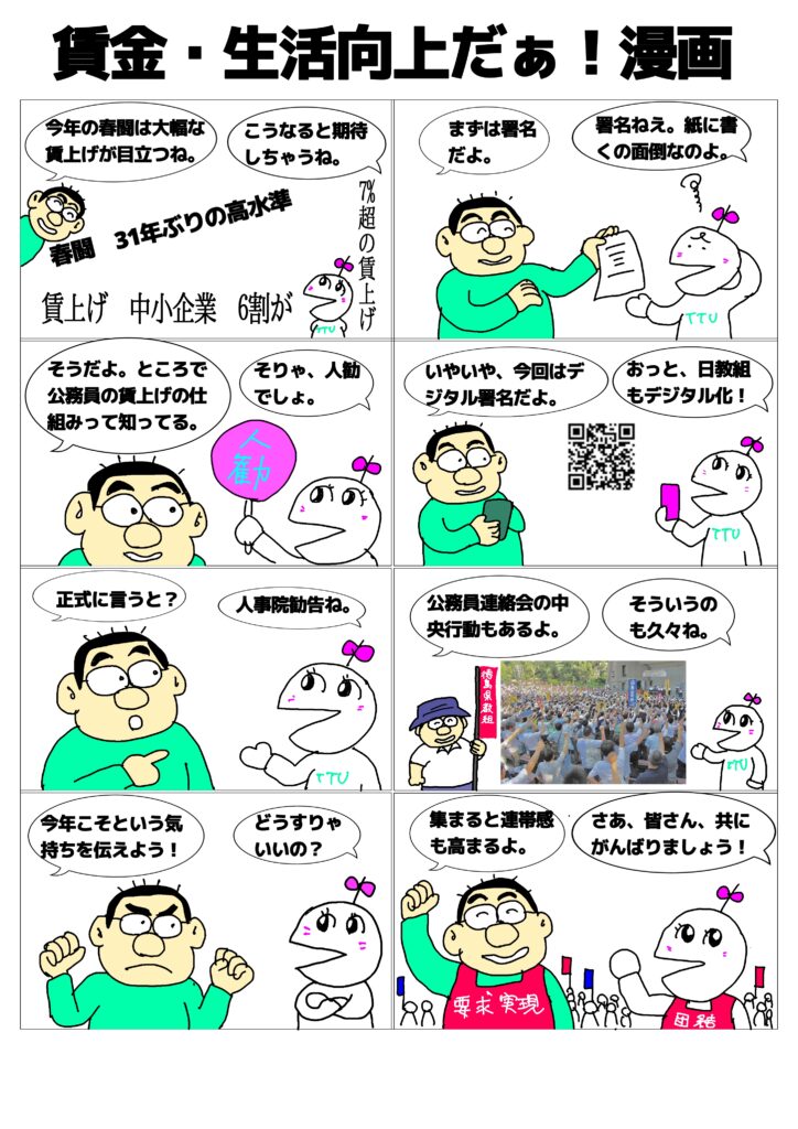 2023年6月21日 / 最終更新日時 : 2023年6月21日 管理人 未分類 賃金・生活向上だぁ!漫画 春闘はこれまでにない賃上げが見られています。賃上げが物価高に追いついていない現実です。賃上げ・生活向上にまずはできるところから取り組もうという漫画です。漫画の画面をクリックすると署名のページへ移動できます。 署名のページへ Bluesky