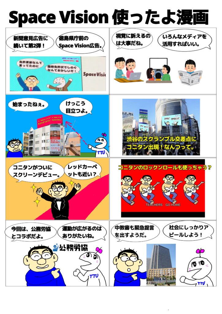2023年6月30日 / 最終更新日時 : 2023年6月30日 管理人 未分類 Space Vision使ったよ!漫画 公務労協とコラボして、徳島県庁前のスペースビジョンに教員不足の現状を訴える漫画を放映中とお知らせする漫画です。本当に学校はピンチです! Bluesky