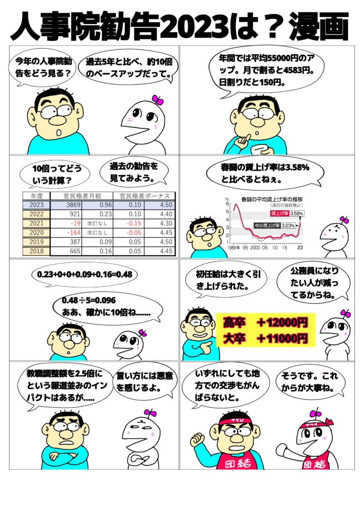 2023年9月4日 / 最終更新日時 : 2023年9月4日 管理人 未分類 人事院勧告2023は?漫画 今年の人事院勧告は過去5年に比べて10倍のアップ率と言いますが、それってどうなのという漫画です。 Bluesky