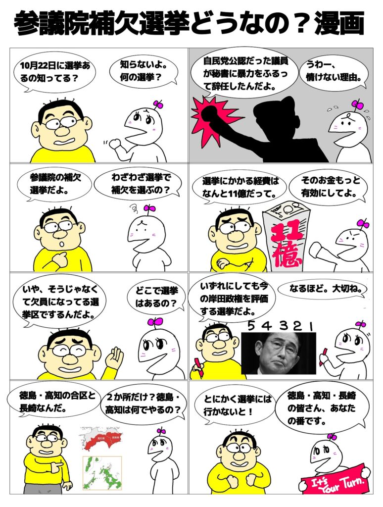 10月5日公示10月22日投票で予定されている参議院補欠選挙は,今後を占う上で,重要な意味を持つ選挙ですが,一般市民の関心が低かったり,あることも知らなかったりということで,「徳島・高知・長崎の皆さん選挙ですよ!」とお知らせする漫画です。