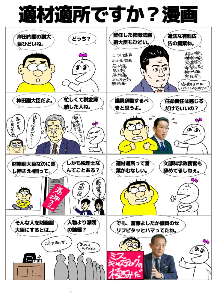 2023年11月10日 / 最終更新日時 : 2023年11月10日 管理人 未分類 適材適所ですか?漫画 内閣改造のたびに続く,閣僚などの辞任。適材適所とは何だと言いたい気持ちを漫画にしました。 Bluesky