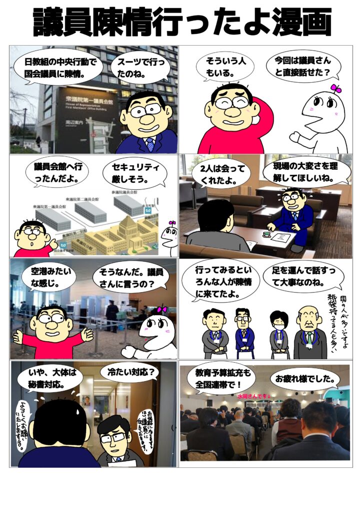 2023年11月16日 / 最終更新日時 : 2023年11月16日 管理人 未分類 議員陳情行ったよ!漫画 教育予算拡充のための日教組中央行動に行きました。国会議員の皆さんを訪ねての陳情と集会などです。コロナウィルス感染症の影響で4年ぶりの対面での中央行動でした。漫画で報告です。 Bluesky