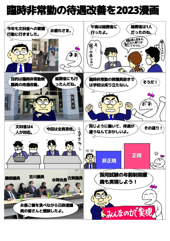 2023年12月5日 / 最終更新日時 : 2023年12月5日 管理人 未分類 臨時・非常勤の待遇改善を2023漫画 12月4日(月)に臨時・非常勤の待遇改善を求めて,文科省・総務省に要請行動に行きました。その様子を漫画にまとめてみました。 Bluesky