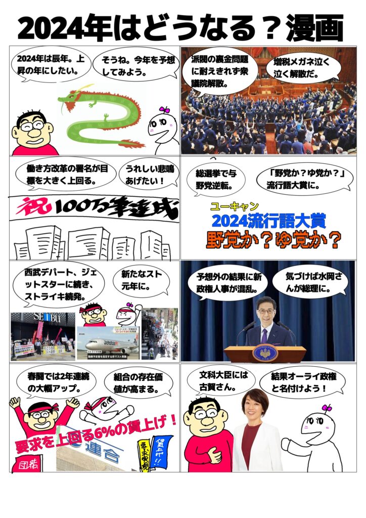 2024年1月5日 / 最終更新日時 : 2024年1月5日 管理人 未分類 2024年はどうなる?漫画 2024年がスタートしました。三が日に震災、飛行機事故、火災、と予想だにしなかった厳しい年明けとなっています。そんな中ですが、今年を占う漫画を描いてみました。 Bluesky