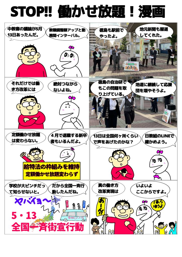 2024年5月15日 / 最終更新日時 : 2024年5月15日 管理人 未分類 STOP 働かせ放題!漫画 5月13日に中教審の特別部会が審議結果をまとめました。それを受けて日教組では全国一斉の街宣行動を実施しました。徳島でもやりましたよ。 Bluesky
