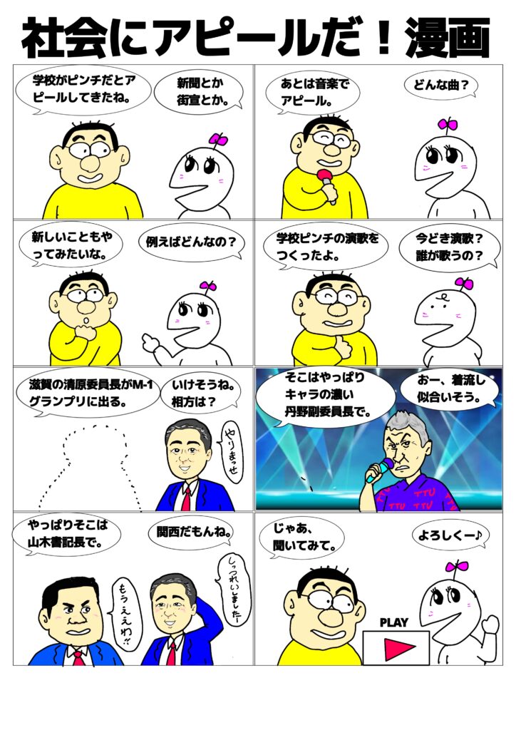 学校における働き方改革を進めるためには、これを社会的課題だと世間の皆さんに受け止めてもらうことが大切ですね。ということで、社会にアピールするための方法考えてみました。学校のピンチをアピールする演歌は漫画の下にあります。よかったら「いいね👍」を押してくださいね。
