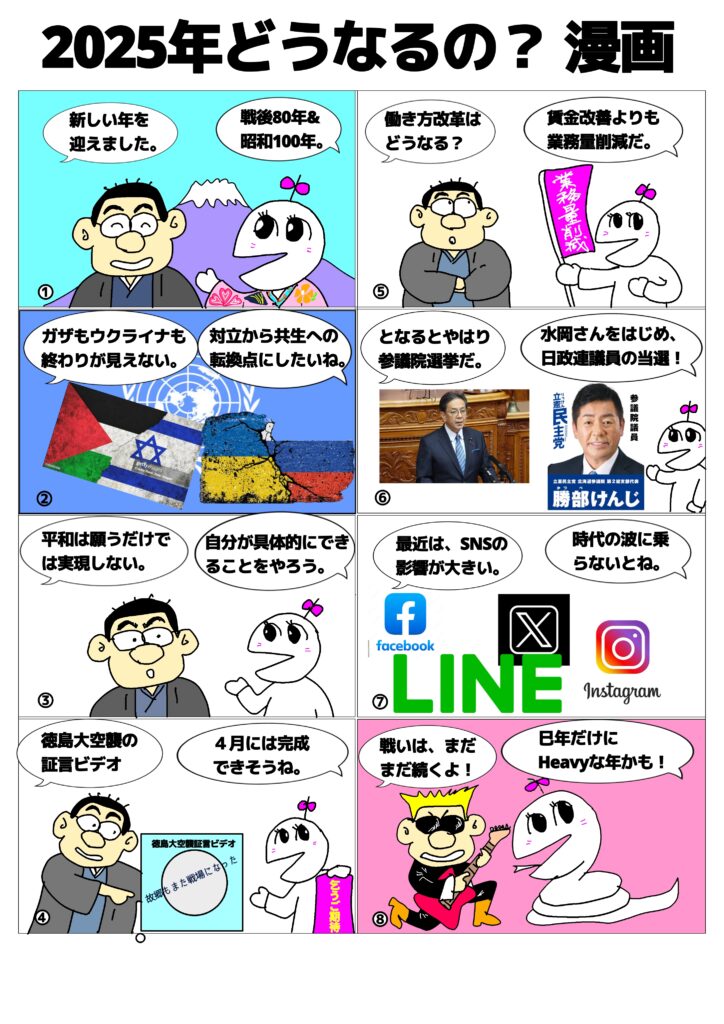 2025年1月8日 / 最終更新日時 : 2025年1月8日 管理人 未分類 2025年はどうなる?漫画 2025年が明けました。さて、先が見通せないこの時代、今年はどうなるのか考える漫画です。 ちなみに、2024年の漫画はあたっていたか?気になる方はここをクリック。 Bluesky