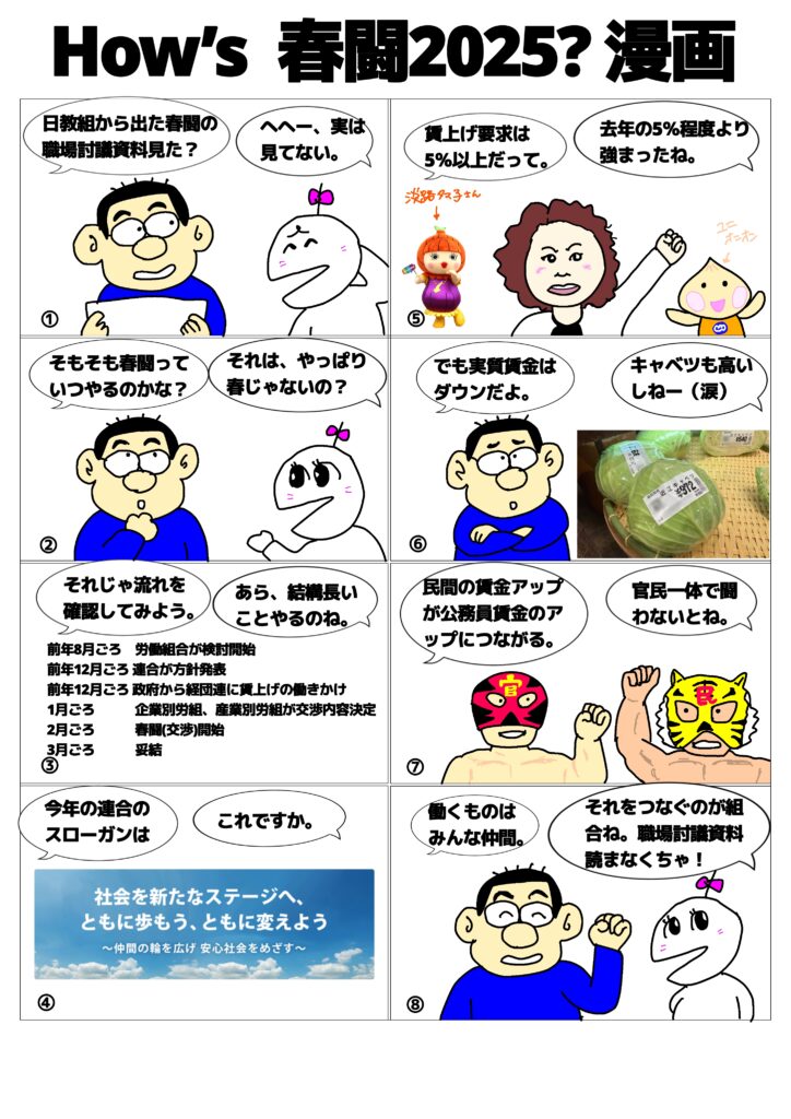 2025年1月21日 / 最終更新日時 : 2025年1月22日 管理人 未分類 How’s 春闘2025?漫画 昨年は5%の賃上げが実現しました。さて、今年の春闘やいかに?勉強しないとね。 春闘とは? 目的や要求・交渉の内容、時期と流れ、誕生の背景を解説:朝日新聞SDGs ACTION! Bluesky