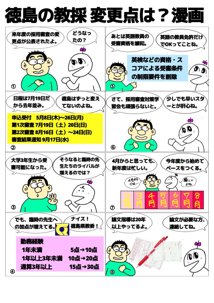 2025年2月4日 / 最終更新日時 : 2025年3月28日 管理人 未分類 徳島の教採 変更点は?漫画 徳島県教委が教員採用審査の変更点を公表しました。漫画にまとめました。漫画をクリックすると徳島県教委のページに進めます。 Bluesky