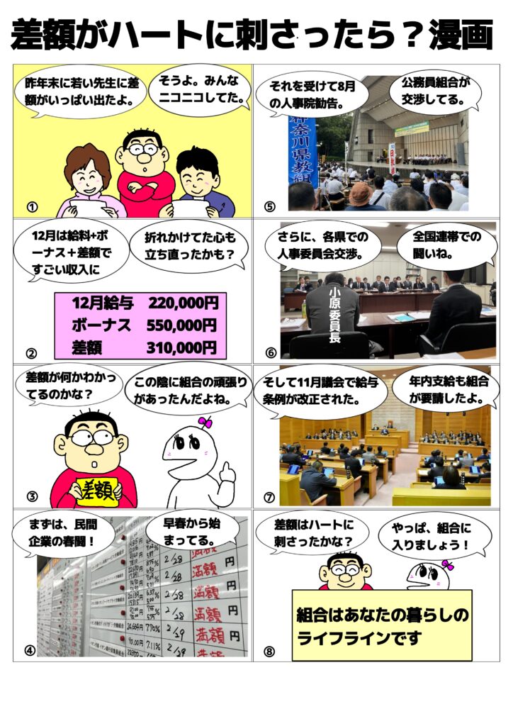 2025年2月26日 / 最終更新日時 : 2025年2月26日 管理人 未分類 差額がハートに刺さったら?漫画 昨年12月に支給された差額は、若者にとって特に大きな額の支給になりました。「先生のおかげで、いっぱい差額がもらえたって聞いたよ。これからもがんばります。」と言われた組合の委員長もいたようですね。さて、差額はハートに刺さったかな? Bluesky