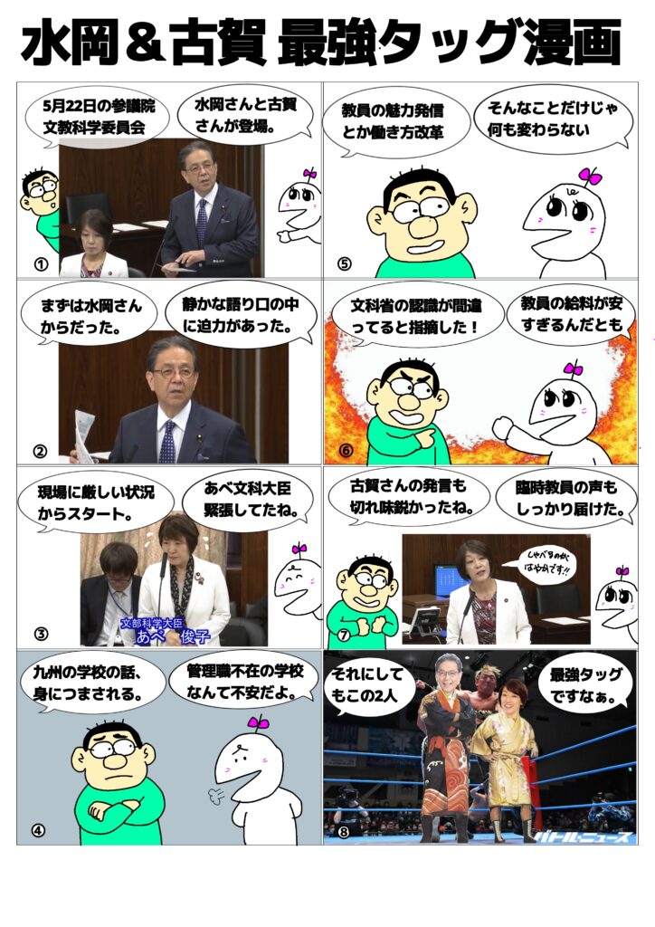 2025年5月25日 / 最終更新日時 : 2025年5月28日 管理人 未分類 水岡&古賀 最強タッグ漫画 5月22日の参議院文教科学委員会で水岡俊一さんと古賀千景さんが質疑に立ちました。本当に現場の声を反映し,問題の本質に迫る発言でした。いやあ,よかったです。ぜひ,全国の皆さんに知ってほしいと考え,漫画にしました。漫画をクリックすると水岡さんの発言のYouTube動画に移動することができます。見てくださいね。 Bluesky