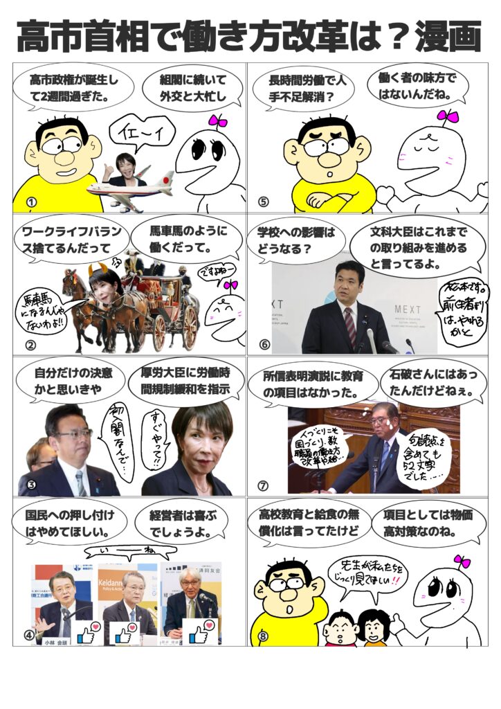 2025年11月5日 / 最終更新日時 : 2025年11月5日 管理人 未分類 「高市首相で働き方改革は?」漫画 高市政権がスタートして2週間が過ぎました。国会の論戦もようやくスタート。労働時間の規制緩和を厚労大臣に指示した影響は学校に及ぶのでしょうか? Bluesky