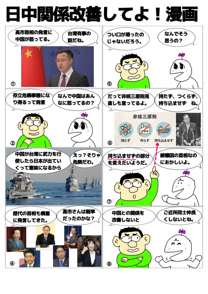 2025年11月18日 / 最終更新日時 : 2025年11月18日 管理人 未分類 日中関係改善してよ!漫画 高市首相の発言が日中関係の悪化を招いています。首相の肩を持つような報道も見受けられますが、隣国との関係は対立より対話で改善してほしいものです。 Bluesky
