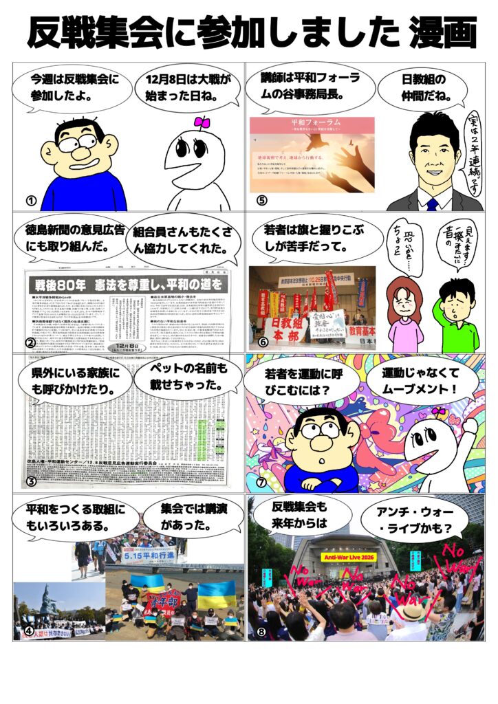 2025年12月10日 / 最終更新日時 : 2025年12月10日 管理人 未分類 反戦集会に参加しました 漫画 12月8日には全国各地で反戦集会が開かれたことと思います。徳島でも集会がありました。その報告の漫画です。 Bluesky