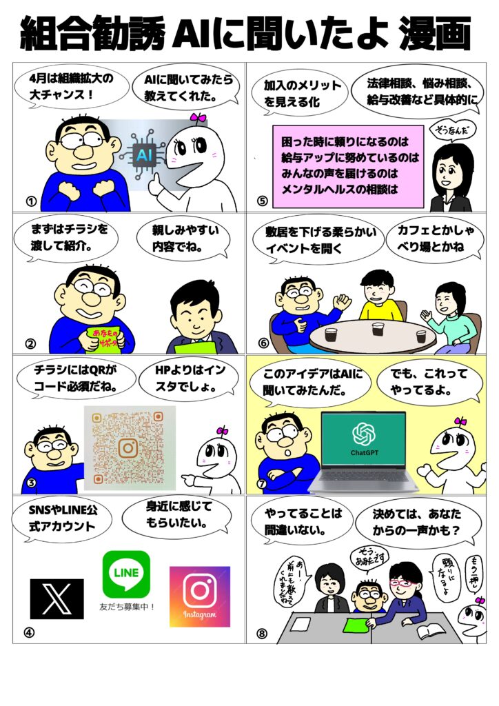 2025年4月3日 / 最終更新日時 : 2025年4月9日 管理人 未分類 組合勧誘 AIに聞いたよ 漫画 4月は組織拡大の大チャンスです。いい方法はないかと「AI」にたずねてみたら、教えてくれました。 Bluesky