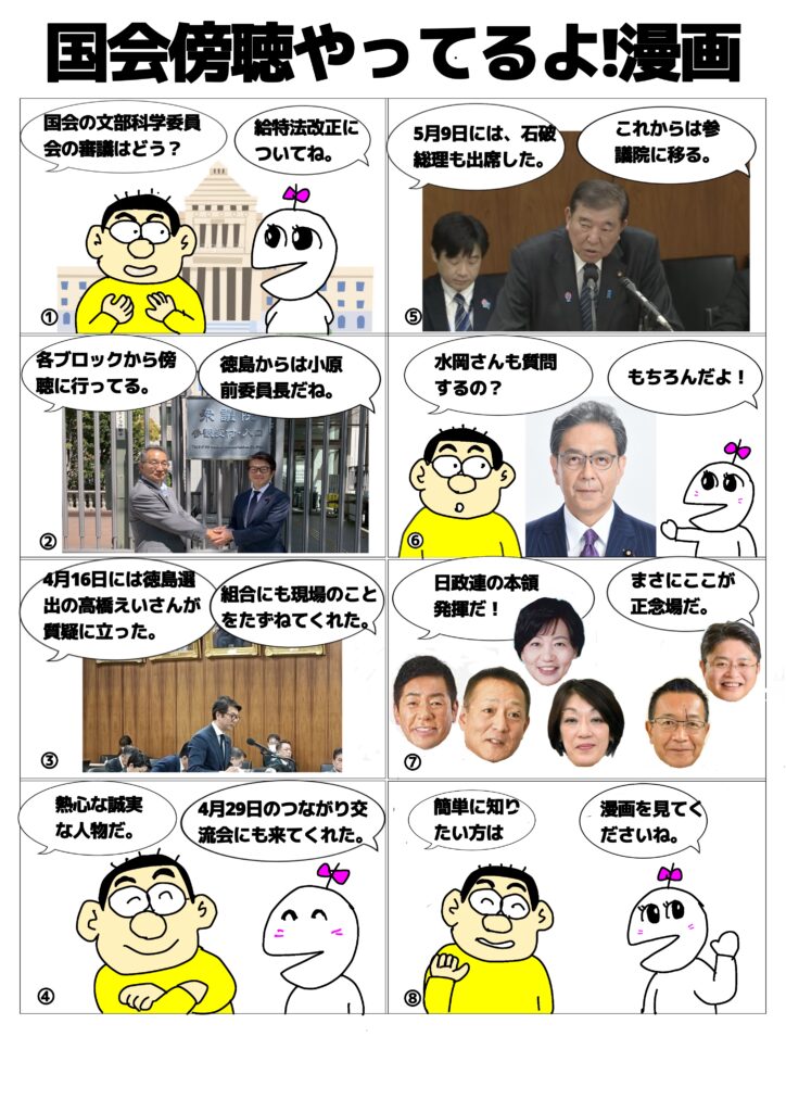2025年5月10日 / 最終更新日時 : 2025年5月10日 管理人 未分類 国会傍聴やってるよ!漫画 衆議院の文部科学委員会では、給特法改正に関わる質疑が行われました。徳島からも傍聴に行きましたので、漫画にしました。これからは参議院での議論が進みます。日政連の皆さんの力が発揮されるときですね。 Bluesky