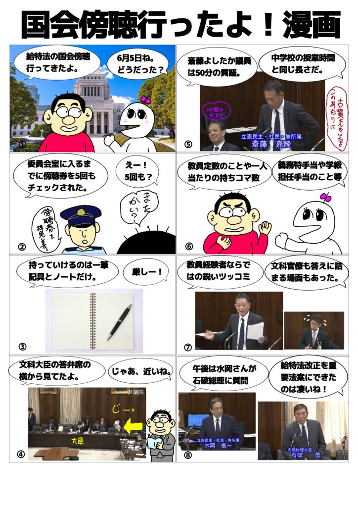 6月5日の参議院文教科学委員会の傍聴行動に行きました。この日は、午後に石破総理も出席しました。給特法改正法案を重要法案にできたのはすごいですね。当然ながら,斎藤さんと水岡さんの質疑は、さすが現場出身の意見は鋭いと思えるものでした。やっぱり日政連議員は重要です。