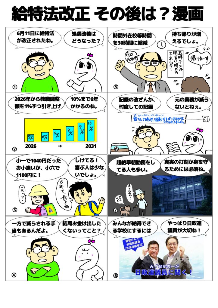 2025年6月18日 / 最終更新日時 : 2025年6月18日 管理人 未分類 給特法改正 その後は 漫画 6月11日に給特法が改正されました。学校の働き方改革は、まだまだ道半ばです。 Bluesky