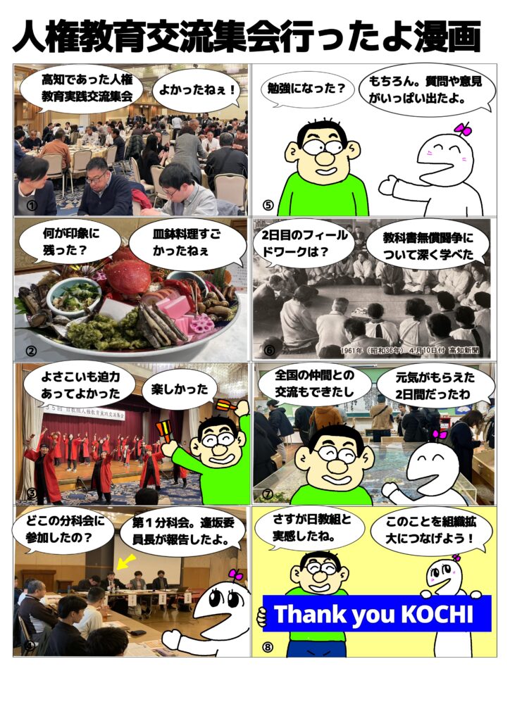 2026年2月23日 / 最終更新日時 : 2026年2月23日 管理人 未分類 人権教育実践交流集会に行ってきました漫画 2月21日、22日の2日間、高知市で日教組人権教育実践交流集会に参加しました。充実の2日間を漫画で報告します。 Bluesky